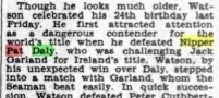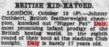 El 9 de octubre de 1929, con 79 victorias, 6 derrotas y 6 nulos, se enfrentó a uno de los rivales más duros de su carrera: Johnny Cuthbert -imagen-, un boxeador experimentado, nueve años mayor que él (25), que llegaba con un récord de 91 victorias, 23 derrotas y 14 nulos. Se había medido con algunos de los mejores púgiles de su tiempo y había sido campeón británico del peso pluma bajo el National Sporting Club, precedente del título británico oficial reconocido posteriormente por la British Boxing Board of Control (BBBofC). El combate comenzó igualado, pero Daly empezó a imponer su boxeo, controlar la distancia y llevarse los asaltos. Todo parecía a su favor hasta que, en el octavo asalto, recibió una mano que lo dejó fuera de combate. Fue uno de los KOs más duros que había sufrido hasta ese momento. Aun así, se recuperó sin aparentes secuelas y en menos de dos meses ya estaba de vuelta sobre el ring.