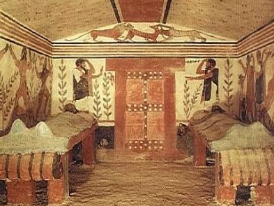 En la pared izquierda aparecen dos púgiles en combate, acompañados por un músico que toca el aulos. Los boxeadores parecen llevar las manos desnudas o con vendas ligeras similares a himantes, lo que sugiere una práctica técnica ritualizada. El combate no responde a un contexto deportivo reglado como en Grecia, sino a una representación ritual propia de la cultura etrusca.