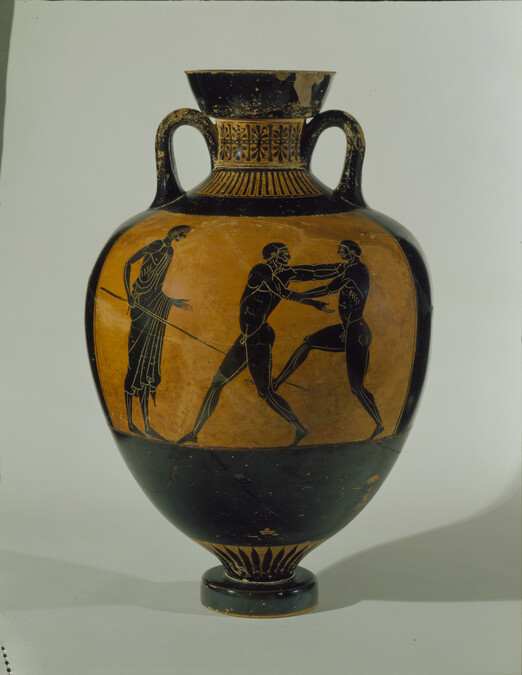 Cerámica ática de figuras negras, datada aproximadamente de comienzos del V a.C., dentro del tránsito del periodo arcaico al clásico. Este tipo de piezas fueron producidas en Atenas, principal centro cerámico del mundo griego, y difundidas por todo el Mediterráneo. Aunque el ejemplar concreto no cuenta con un contexto arqueológico preciso, su estilo y composición permiten situarlo con seguridad en la tradición ateniense de este periodo.
