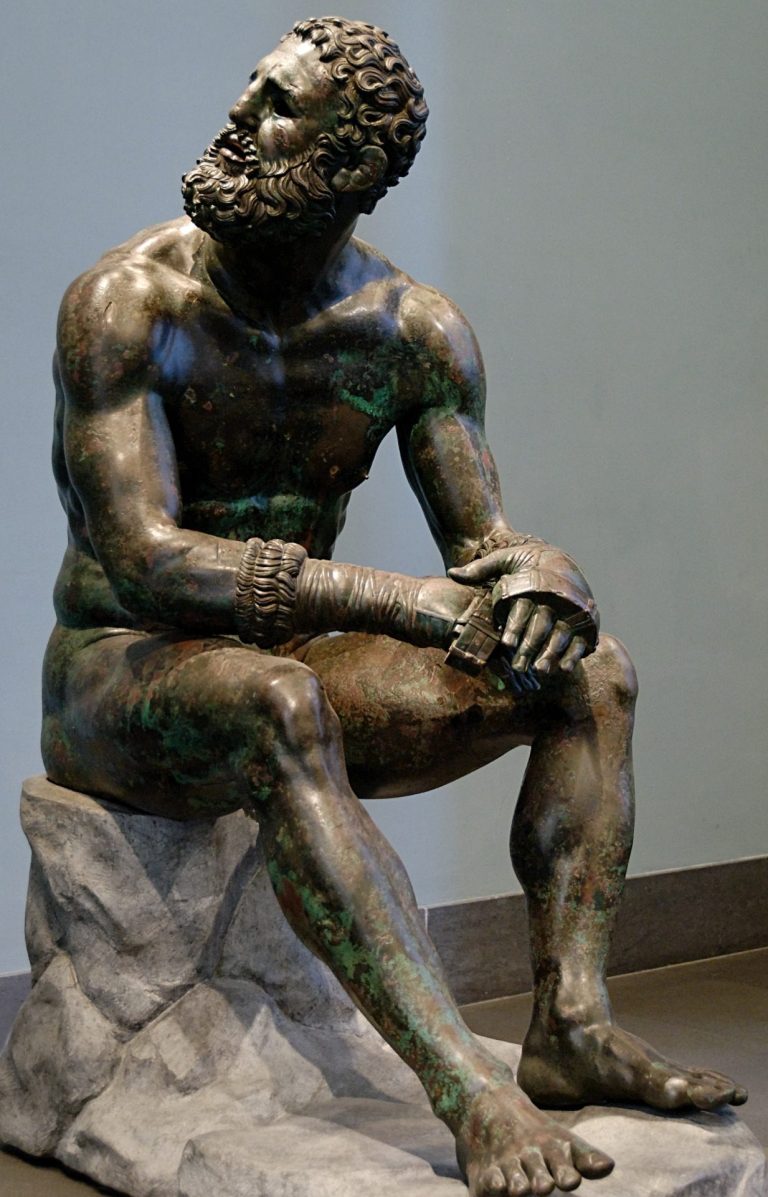 El llamado Púgil en reposo es una escultura de bronce perteneciente al periodo helenístico, datada aproximadamente entre los siglos IV y II a.C. Fue descubierta en 1885 durante excavaciones en la colina del Quirinal, en Roma, cerca de las antiguas Termas de Constantino. La pieza apareció cuidadosamente enterrada, lo que permitió su conservación casi intacta, algo excepcional en esculturas de bronce de la Antigüedad, muchas de las cuales fueron fundidas con el paso del tiempo.